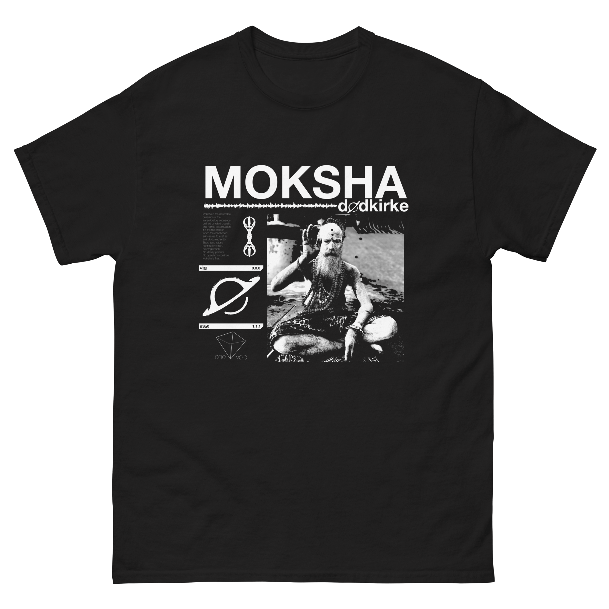 100% cotton t-shirt featuring the official art from MOKSHA by dødkirke.