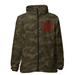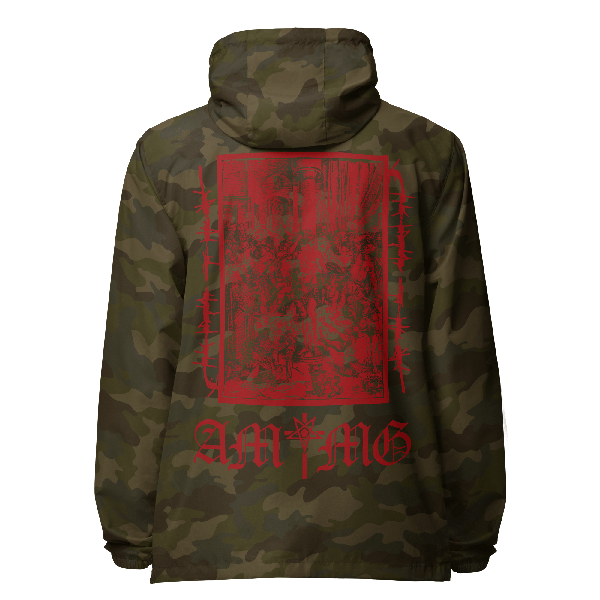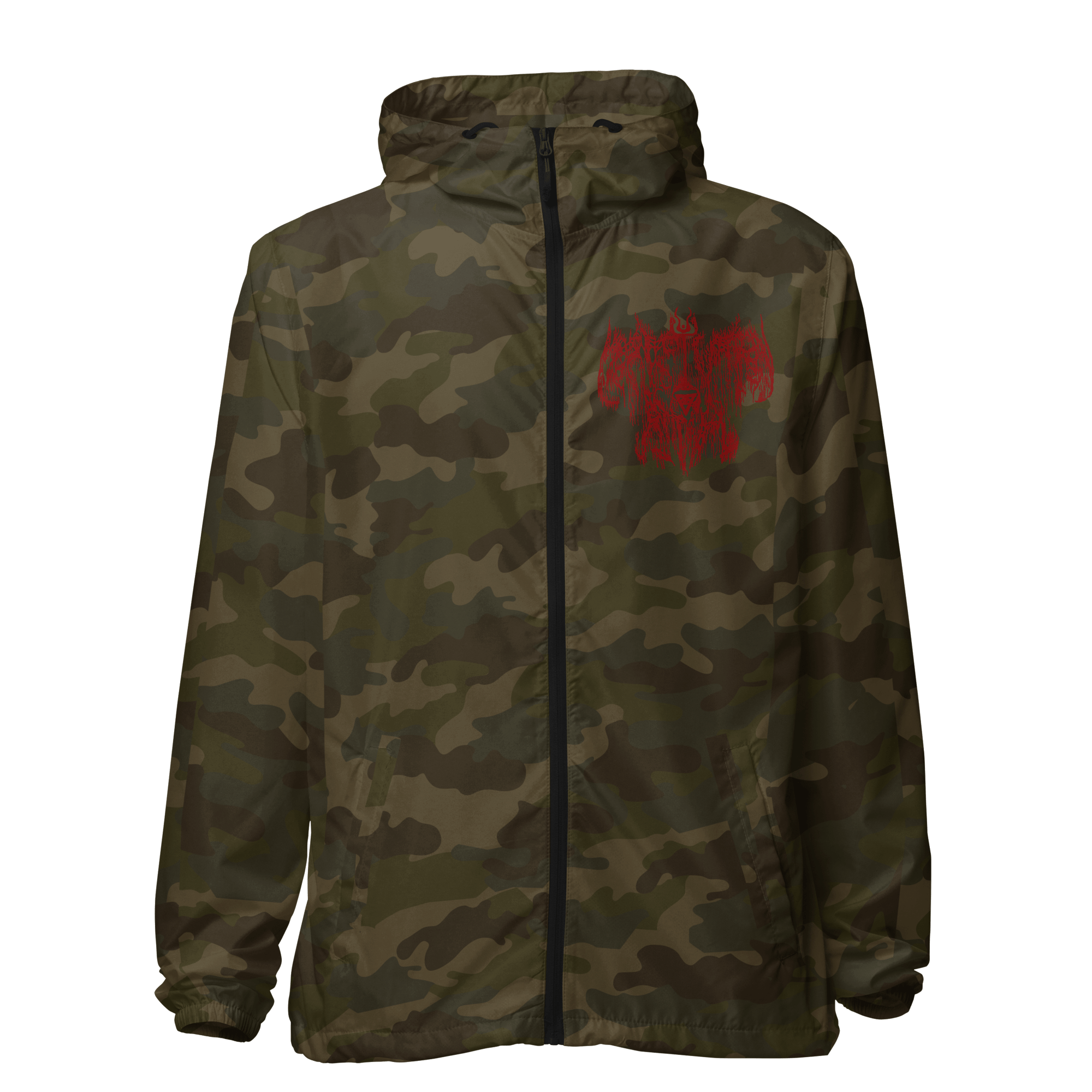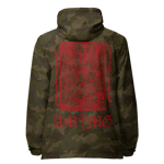 100% polyester camo water-resistant windbreaker with a three-panel hood, featuring artwork from Mortification Ritual.